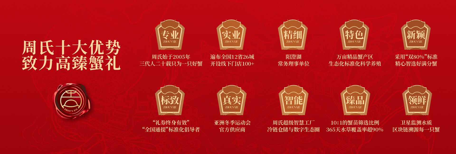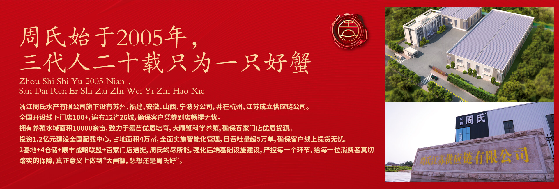周氏水產(chǎn)精品大閘蟹,14年匠心沉淀,全國87家直營門店,100只大閘蟹只精選最優(yōu)50只。不虛標(biāo)規(guī)格,不玩???